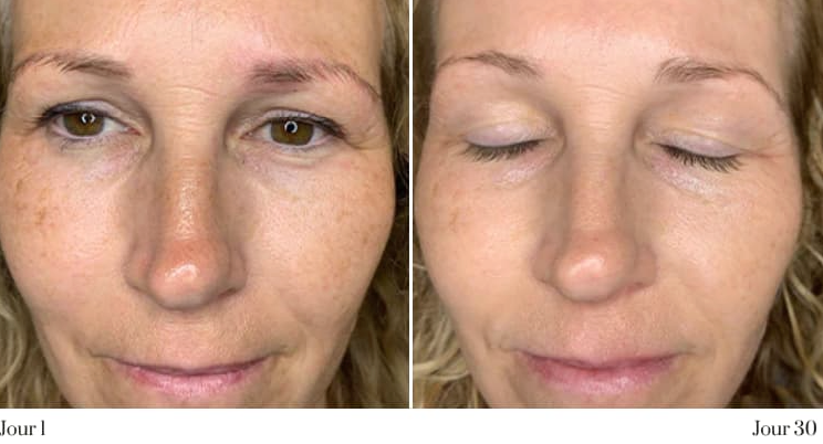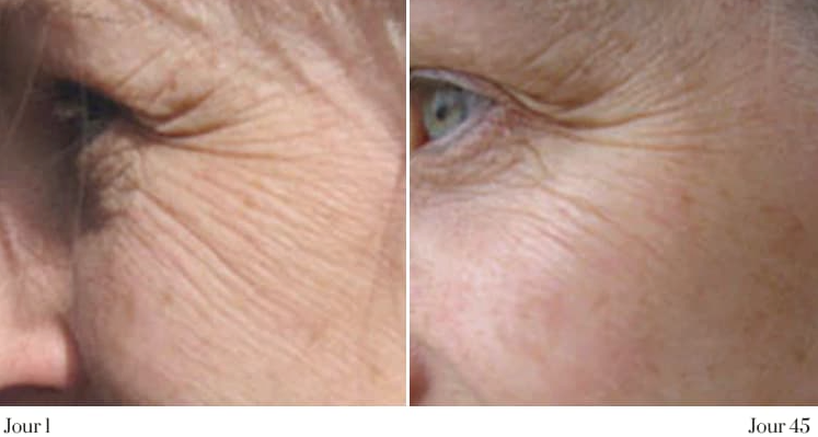 Les premiers signes apparaissent vers deux semaines (éclat, confort), se renforcent autour de six semaines (peau plus tonique, teint plus uniforme) et s’installent vers trois mois (contours plus nets, rides adoucies). Les résultats varient selon la peau et la régularité d’usage.